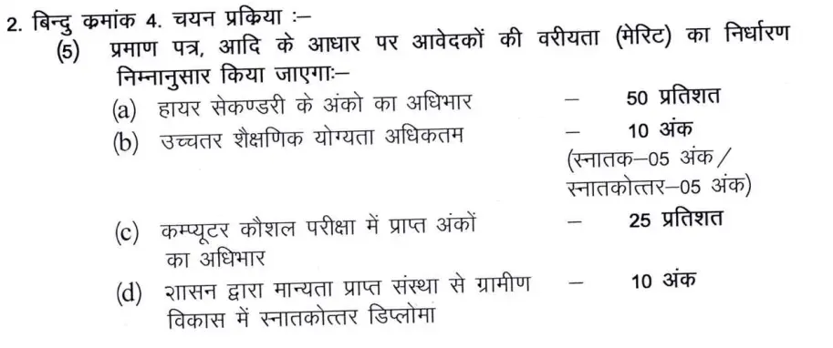 | (e) | रोजगार सहायक पद पर कार्य करने का अनुभव | अधिकतम 05 अंक (प्रत्येक वर्ष 01 अंक) (1 वर्ष = न्यूनतम 09 माह अनुभव) |